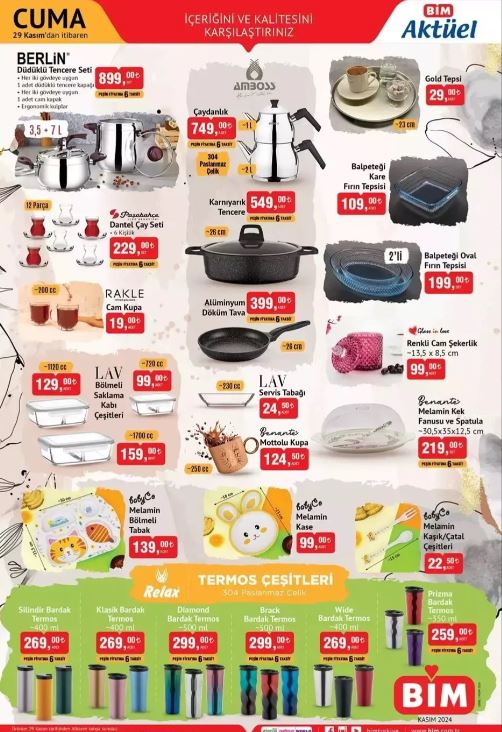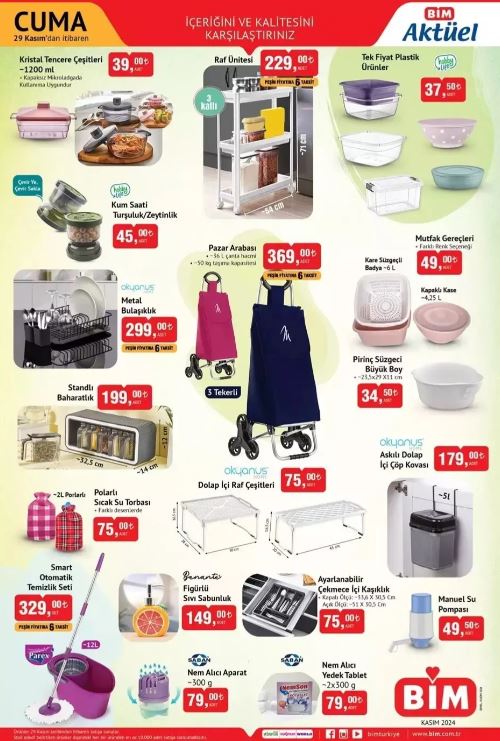 BİM'in yeni haftalık kataloğunda çok cazip fırsatlar sunuyor.Bunun yanı sıra, beyaz eşya ve mutfak setleri, saç kurutma makinesi, kulaklık, ısı yalıtımlı termos, pişirme kapları, raf ünitesi, alışveriş arabası, temizlik malzemeleri ve yatak takımları gibi günlük ihtiyaçlara yönelik çok çeşitli ürünler de rafları süslüyor. İşte, 26-27-29 Kasım tarihleri arasında BİM'deki ürünler