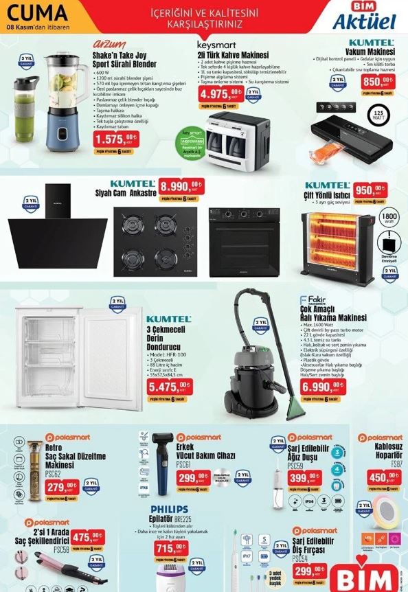 BİM'deki fırsatları kaçırmak istemeyen ve ucuz alışveriş imkanından yararlanmak isteyen vatandaşlar, bu güncel indirimli ürünler kataloğunu incelemeye başladı. BİM mağazalarında bu hafta spor kullanımına uygun şişe blender, Türk kahvesi makinesi, vakum cihazı, çift yönlü ısıtıcı ve derin dondurucu gibi birçok üründe yeni indirimler sunuluyor. İşte 8 Kasım haftasına özel BİM market indirimli ürünleri.