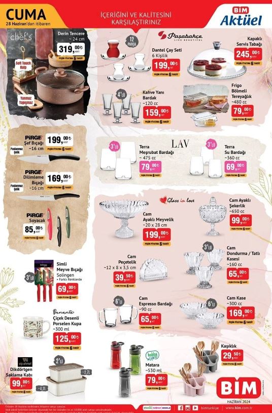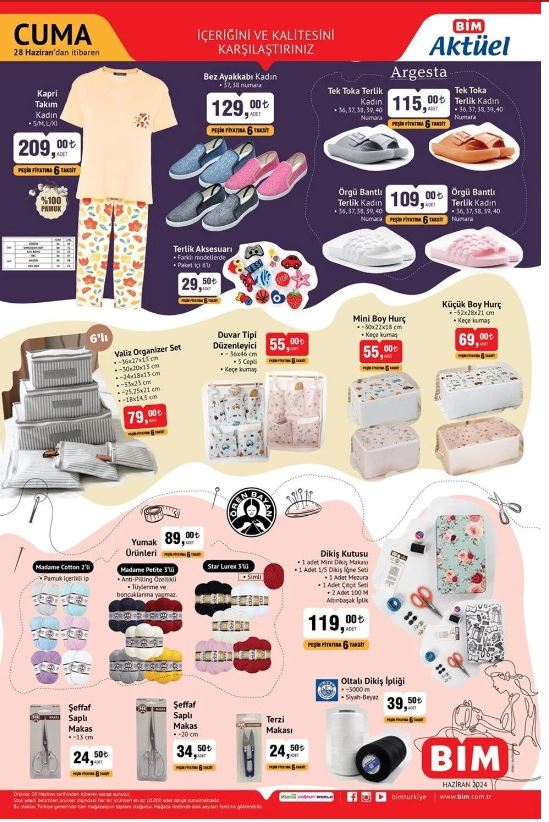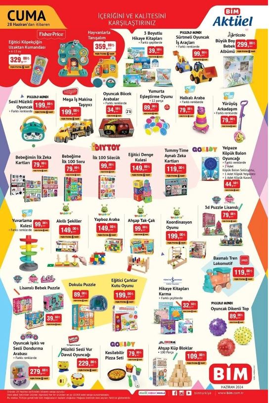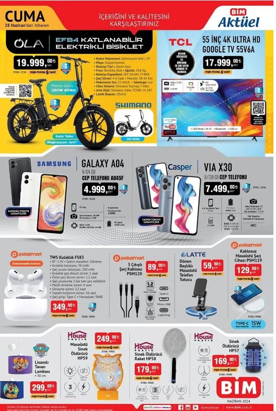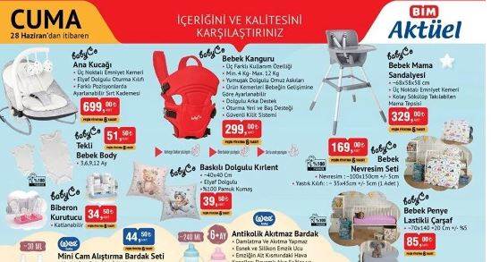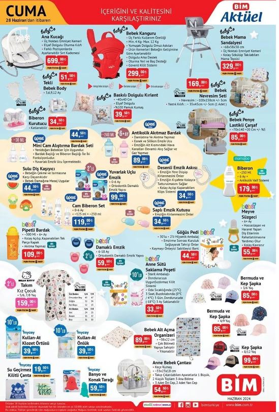 Bim kataloğu Bim'in resmi internet sayfasında duyuruldu. Uygun fiyata alışveriş yapmak isteyenlerin sıkı takip ettiği Bim kataloğunda bu Cuma özellikle bebek bakım ürünleri ve elektrikli katlanır bisiklet öne çıkıyor. 28 Haziran tarihinde geçerli yeni indirimli aktüel ürünler kataloğu ucuz yolla alışveriş fırsatını değerlendirmek isteyen vatandaşlar tarafından araştırılıyor. BİM güncel indirimli aktüel ürünler kataloğunu araştırıyor. BİM'de bu hafta ana kucağı, bebek kanguru, bebek mama sandalyesi, televizyon, vantilatör, elektrikli süpürge ve birçok üründe yeni indirim yer alıyor. İşte 28 Haziran BİM markette bu haftanın indirimli ürünleri.
