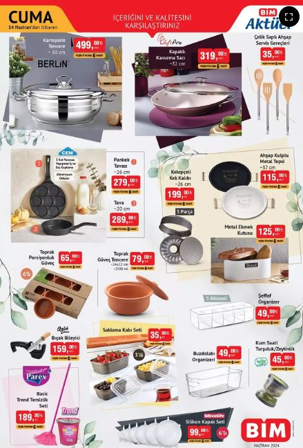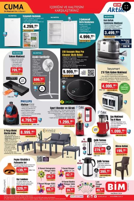 Ayrıca bu haftanın BİM kataloğunda ikili Türk kahvesi makinesi, oturma grubu, gaz lambası, rüzgar gülü, termos gibi ev eşyalarının yanı sıra, koltuk, karnıyarık tenceresi ve kavurma sacı gibi mutfak ürünleri de yer alıyor.