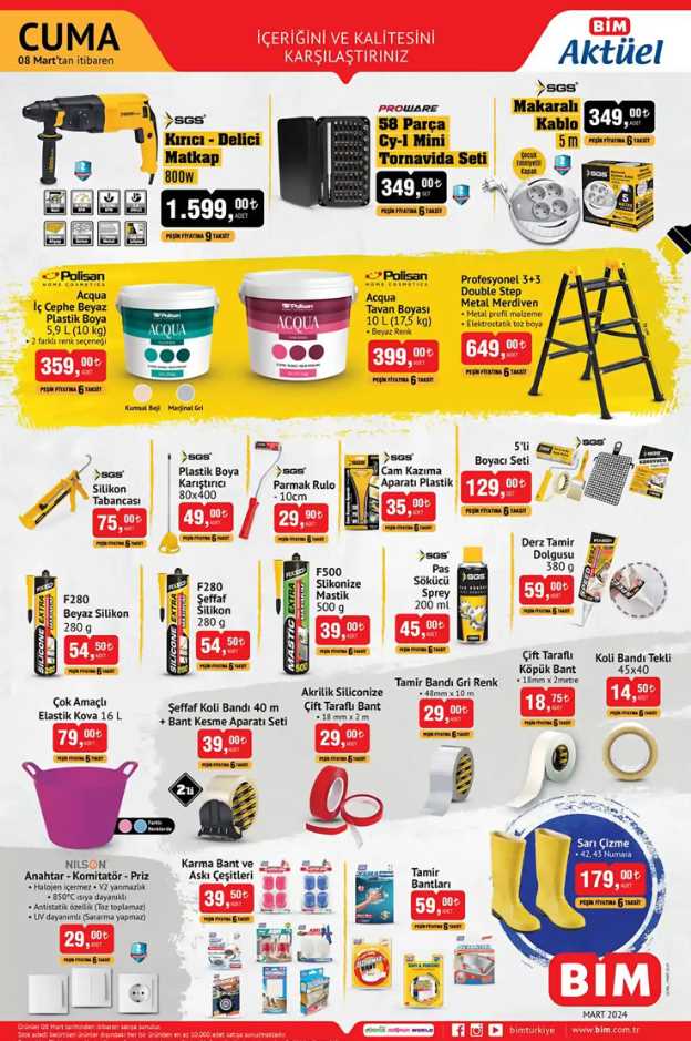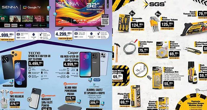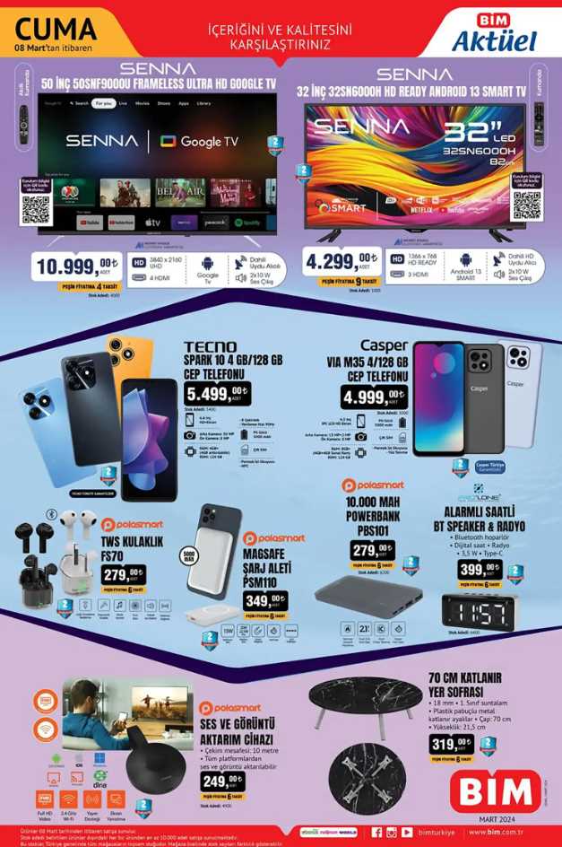 Bu hafta 8 Mart 2024 BİM aktüel ürünler indirim kataloğunda birbirinden çeşitli ürünler yer alıyor! HD Google TV, Casper akıllı telefon, Magsafe şarj aleti, matkap daha fazlası gibi pek çok ürün, cazip indirimlerle sizleri bekliyor. Ev ihtiyaçlarınızı karşılamak veya yaşamınıza yeni bir soluk getirmek istiyorsanız, BİM Aktüel kataloğunu gözden geçirmeyi unutmayın. BİM mağazalarına uğrayarak uygun fiyatlarla ihtiyaçlarınızı karşılayabilir ve tasarruf edebilirsiniz. Bu fırsatları kaçırmamak için hemen en yakın BİM mağazasına gidin ve alışverişin tadını çıkarın!