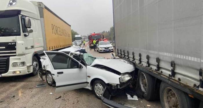 Bolu'nun Gerede ilçesinde K-100 karayolu üzerinde meydana gelen zincirleme trafik kazasında otomobil tıra çarparak hurdaya döndü. Kazada otomobil sürücüsü H.T., araç içinde sıkışarak ağır yaralandı. İhbar üzerine kaza yerine sağlık, polis ve itfaiye ekipleri sevk edildi
