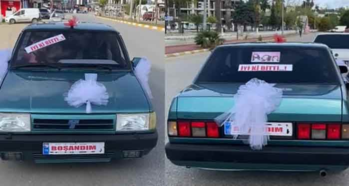 Antalya'nın Serik ilçesinde 6 yıllık eşiyle karşılıklı anlaşarak evliliğini sonlandıran Abdurrahman Akman, otomobilini gelin arabası gibi süsledi, şehir turu yaparak ayrılığını kutladı. Cep telefonu ile kaydettiği görüntüleri sosyal medyadan paylaştı. Serik'te yaşayan Abdurrahman Akman, 6 yıldır evli olduğu ve eşi ile karşılıklı olarak ayrılık kararı aldı. Akman, boşandıktan sonra, eski eşinin sosyal medyada doğum günü pastası üzerine 'iyi ki bitti' yazılı paylaşımını gördü. Bunun üzerine Akman, eski eşine cevap olarak aracını gelin arabası gibi süsledi ve 'boşandım, iyi ki bitti' yazıları yazdırdı. Otomobiliyle şehir turu yaparak ayrılığını kutladı. Cep telefonu ile kaydettiği görüntüleri sosyal medyadan paylaşınca büyük etkileşim aldı.