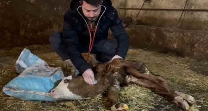 Buzağımızın sol bölgesinde doğuma bağlı olarak bacak bölgesinde kasılma mevcuttu. Vücut derecesi de düşmüş, hatta ölçtüğümde 32 dereceydi. Bu tür doğumlar insanda milyonda 7 ila 8 arasında olmasına rağmen hayvanlarda daha düşük şekilde gözlemleyebiliyoruz. Böyle bir doğum ilk defa başımıza geldi, bizler bu durumla meslek hayatımızda ilk defa karşılaştık” dedi.