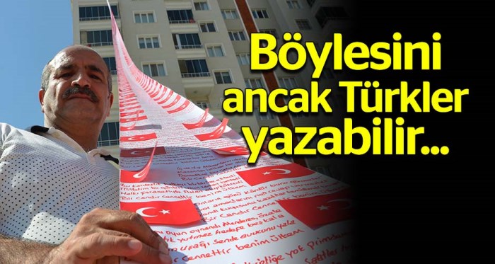 Görenleri hayrete düşüren şiir 24 katlı bir apartman uzunluğunda. Türk Bayrakları ile süslenmiş şiirin sadece yarısı 12 katlı bir apartmandan sarkıtıldığında zemine ulaşırken diğer yarısı ise apartmanın 100 metre uzunluğundaki bahçesine denk geliyor. Büyük bir emek ve özveri ile yazılan şiir dünya literatürüne girecek gibi görünüyor.