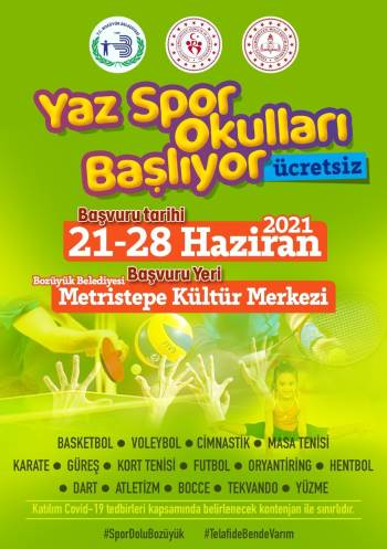Bozüyük’te pandemi kısıtlamalarının ardından başlayan normalleşme süreci ile birlikte gerçekleştirilecek olan yaz spor okulları 15 branşta yapılacak. Yaz boyunca öğrencilerin kendilerini farklı dallarda geliştirebilmelerine ve iyi vakit geçirerek tatili en iyi şekilde değerlendirmelerine fırsat verecek olan kurslara başvurular 21 Haziran 2021 Pazartesi günü başlayıp 28 Haziran 2021 Pazartesi günü sona erecek. Yaz Spor Okulları kapsamında basketbol, voleybol, jimnastik, masa tenisi, karate, güreş, kort tenisi, futbol, oryantiring, hentbol, dart, atletizm, bocce, tekvando ve yüzme gibi toplam 15 branşta düzenlenen kurslardaki eğitimler uzman eğitmenler tarafından verilecek. Tamamen ücretsiz olarak düzenlenen yaz spor okullarına katılmak isteyenler ise başvurularını Metristepe Kültür Merkezi’ne yapabilecekler. Katılımların Kovid-19 tedbirleri kapsamında belirlenecek kontenjanlar ile sınırlı olacağı yaz spor okullarında öğrenciler hem eğlenip hem de öğrenerek yaz tatilini en iyi şekilde değerlendirecekler.