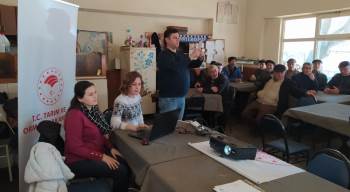 Ziraat Mühendisi Selcen Erol daha sonra çiftçilere hububat yetiştiriciliği, hastalıklar ve zararlılar konusunda slayt eşliğinde bilgi verdi.