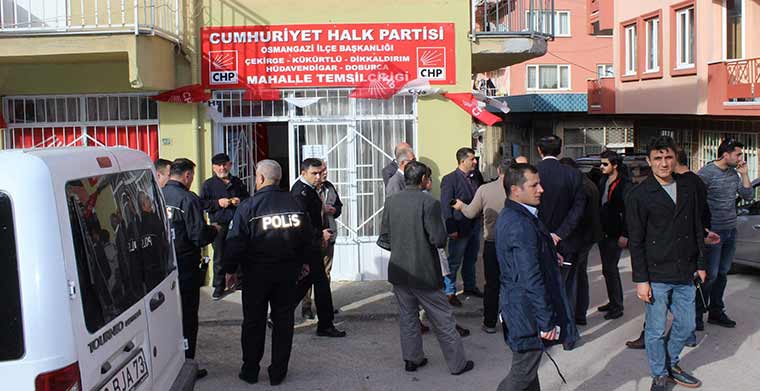 Bursa'da CHP mahalle temsilciliğine saldırı düzenlenirken, 5 kişi gözaltına alındı. Daha önce 2 defa tabelası sökülüp camları kırılan CHP Dikkaldırım Mahalle Temsilciliği'ne gelip görevlileri tehdit ettikleri ve duvarlara provokatif yazılar yazdıkları iddiasıyla 5 kişi gözaltına alındı. CHP Bursa Milletvekili Nurhayat Altaca Kayışoğlu, partilileri tehdit ettiğini iddia ettiğini öne sürdüğü şahısları parti binası önünde görünce göz altına aldırttı. Şahısların gözaltına alınması sırasında kısa süreli gerginlik yaşandı.