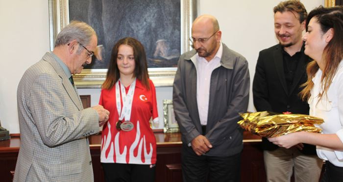 Sümeyye'yi alnından öperek kutlayan Büyükerşen, "Cumhuriyet kızına Cumhuriyet altını yakışır." diyerek ödül verdi.