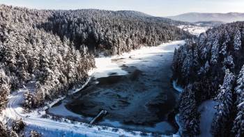 Bilecik’in gözde mesire alanlarından olan ve hafta sonları ziyaretçi akınına uğrayan Bozcaarmut Göleti, kar yağışı sonrası güzel bir görüntüye büründü. Bölgede hava sıcaklığı eksi derecelere düşerken, gölet buz tuttu. Drone ile havadan görüntülenen doğa harikası gölet, güzelliği ile adeta büyüledi.