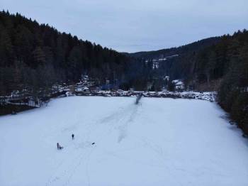 Bilecik’in Göletler Diyarı olarak bilinen Pazaryeri ilçesindeki Bozcaarmut Göleti etkili olan kar yağışı ve soğuk hava nedeniyle tamamen dondu. Buz tutan göledin üzerinde yürüyenler adeta tehlikeye davetiye çıkardı.