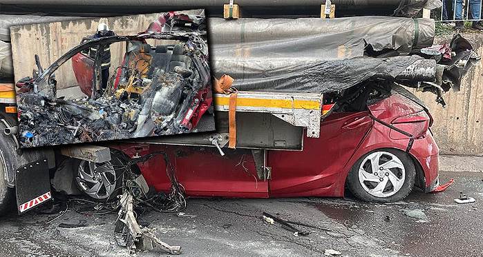 Kocaeli'nin Dilovası ilçesinde park halindeki tırın altına giren otomobilde yangın çıktı. Feci kazada sürücü hayatını kaybetti, otomobilin son hali ise görenleri hayrete düşürdü.