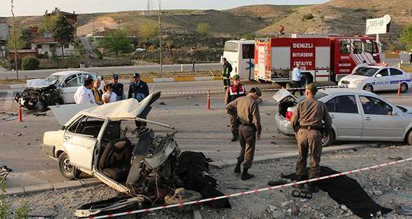 Dün akşam saatlerinde Denizli-Ankara Karayolu Gürlek Mahallesi yakınlarında meydana geldi. Denizli istikametine doğru ilerlemekte olan Ersan U. idaresindeki 20 BP 075 plakalı otomobil, sürücüsünün direksiyon hakimiyetini kaybetmesi sonucu yoldan çıkarak refüjleri de aşarak karşı yola geçti. Otomobil, Ankara istikametine doğru ilerlemekte olan önce Emrah Turan idaresindeki 20 DU 762 plakalı araca çarptı. Daha sonra Ülfet Menteşeli idaresindeki 17 ES 830 plakalı araçla çarpışan otomobil, güçlükle durabildi. Kazanın etkisiyle araçlar savrulurken, ilk çarpılan araçta bulunan Emrah Turan, Fatma Turan ve Doğan İlker olay yerinde hayatını kaybetti. Kazayı görenler durumu polis ve sağlık ekiplerine haber verirken, kısa sürede olay yerine gelen ekipler, yaralılara ilk müdahaleyi kaza yerinde yaptı. 3 aracın karıştığı kazada yaralanan Ersan U., Şehrazat U., Ülfet Menteşeli ve Musa Öztürk Denizli Devlet Hastanesi ve Pamukkale Üniversitesi Hastanesi’ne kaldırıldı. Bu arada kazaya karışan bir aracın motorunun 50 metre öteye fırlaması dikkat çekti.