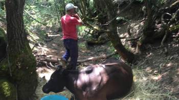 Bilecik’te, otlarken dere yatağına düşen ve ayağı kırılan inek, saatlerce kurtarılmayı bekledikten sonra sıkıştığı yerden kepçe yardımı ile çıkartıldı ve veteriner hekim kontrolünde kesildi.