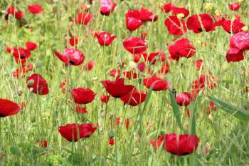 Bilecik’te baharla birlikte kendiliğinden yetişen gelincikler ovaları kırmızıya boyadı.