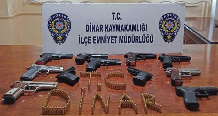 Edinilen bilgilere göre, geçtiğimiz günlerde Dinar’da gerçekleştirilen bir sokak düğününde havaya ateş açıldığı ihbarını alan polis ekipleri harekete geçerek inceleme başlattı. Yapılan incelemelerde düğüne katılan ve havaya ateş açtıkları belirlenen Y.B., F.B., B.C., R.O.Ö., Y.A.B., S.K., B.A.Ö. ve D.G., isimli 8 şahıs gözaltına alındı. Şahısların Afyonkarahisar kent merkezi başta olmak üzere Dinar, Dazkırı ilçeleri ile Denizli’nin Çivril ilçesinde ev ve iş yerlerine de baskın düzenleyen ekipler 7 adet ruhsatlı silah, 5 adet kuru sıkı olmak üzere toplam 12 adet silah ve bu silahlara ait değişik çapta 520 adet mermi ele geçirdi.