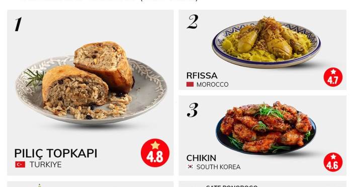 Listenin ikinci sırasında yer alan Fas’ın ünlü yemeği Rfissa, aromatik baharatlarla tatlandırılmış tavuk eti, mercimek ve msemen ekmeğiyle hazırlanan geleneksel bir lezzet. Kuzey Afrika mutfağının zengin baharat profilini başarılı şekilde temsil ediyor.