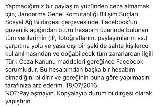 "Mesaj, 'Yapmadığımız bir paylaşım yüzünden ceza almamak için, Jandarma Genel Komutanlığı Bilişim Suçları Sosyal Ağ Bildirgesi çerçevesinde, Facebook'un güvenlik açığından ötürü hesabım üzerinde bulunan tüm verilerimin (IP, fotoğraflarım, paylaşımlarım vs.) çarpıtma yolu ve yasa dışı bir şekilde sahte kişilerce kullanılmasından ve doğabilecek tüm zararlardan ilgili Türk Ceza Kanunu maddeleri gereğince Facebook sorumludur. Bu hesabımdan başka bir hesabım olmadığını bildirir ve gereğinin buna göre yapılmasını tarafınıza arz ederim. NOT: Paylaşmayın. Kopyalayıp durum bildirgesi olarak yapıştırın' diye devam ediyor. Bu mesajı kullanarak vatandaşta belli bir farkındalık oluşturuyorlar. Böylece, iletişim kurduklarında kurban bu konuda daha önce resmi bir girişim bulunduğuna inanmış oluyor. En azından bu konuda bir gelişme olduğunu bir yerlerden hatırlıyor.Bu hazırlık dolandırıcıların işini oldukça kolaylaştırmaktadır."