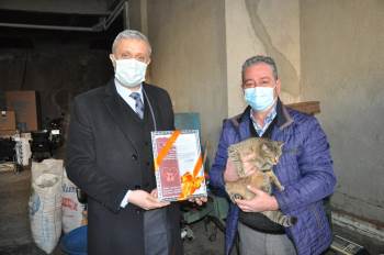 Kütahya’nın Simav ilçesindeki mahalle muhtarlarını ziyaret eden Simav Belediye Başkanı Adil Biçer, soğuk kış günlerinde çok sayıda kediyi iş yerinde besleyip barındıran Tabakhane Mahallesi Muhtarı Ömer Ertürk’e teşekkür belgesi verdi.