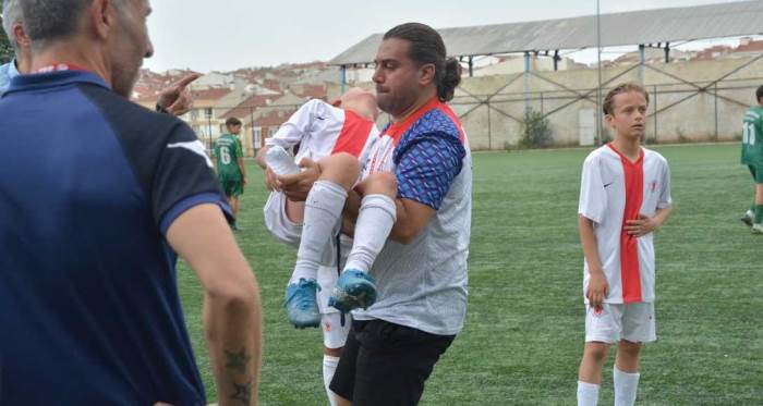 U-13 Ligi’nde Demirspor ile Şekerspor arasında oynanan karşılaşmada Demirspor’un oyuncusu Efe Kemal Bozkurt, rakibine müdahale etmek istersen talihsiz bir sakatlık yaşadı. Sakatlanan oyuncuyu antrenörü kucaklayarak çıkardı.