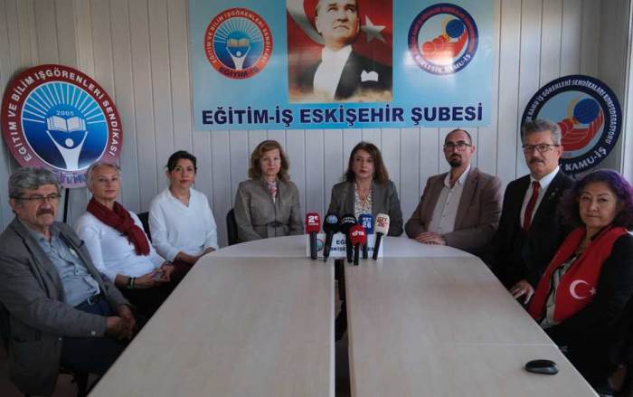 Eğitim-İş, Atatürkçü Düşünce Derneği, Çağdaş Yaşamı Destekleme Derneği, Eskişehir Çevre Derneği, Eskişehir Kültür ve Sanat Derneği, Memleket Sevdalıları Derneği, ODTÜ Eskişehir ve Çevresi Mezunları Derneği, Türk Üniversiteli Kadınlar Derneği, Türkiye Emekli Öğretmenler Derneği ve Yeni Kuşak Köy Enstitülüler Derneği’nin ortak düzenlediği basın açıklamasında konuşan Eğitim-İş Şube Başkanı Fadime Arslan, Cumhuriyet değerlerine ve Atatürk ilke ile devrimlerine sahip çıkmanın önemine vurgu yaparak, Eskişehirlileri 29 Ekim’de Atatürk Caddesi girişinden başlayıp Valilik Meydanı’nda son bulacak olan Cumhuriyet Yürüyüşü’ne davet etti. Atatürk’ün “En doğru, en hakiki tarikat, medeniyet tarikatıdır” sözüne atıfta bulunan Eğitim-İş Şube Başkanı Arslan,“Atatürk, gereken yolu bizlere göstermiş olsa da bugün başta devrim yasaları çiğnenmekte, Atatürk ilke ve devrimleri doğrultusunda oluşturulan çağdaş yaşam hedefi terk edilmekte, cumhuriyete, kurucularına, değerlerine hakaret edenler, cezasızlık politikalarıyla dolaylı olarak teşvik edilmekte kadın-erkek eşitliği anlamına gelen Cumhuriyetimizde kadınlarımız gericiliğin tehdidiyle yüz yüze kalmaktadır. Ülkemizin dört bir yanında eğitim, kültür ve sosyal alanda cumhuriyet karşıtı unsurların cesaret bulduğu bir ortam yaratılmaktadır. Bu karanlık niyetler, cumhuriyetin ve kurucularının bizlere bıraktığı akıl ve bilim ışığında yürümemiz gereken yoldan sapmamızı hedeflemektedir. Cumhuriyetimizin 102. yılında coşkuyla kutlanması gereken bu değerlerin, çeşitli çevrelerin gölgelemeye çalıştığı dönemde dahi kararlılıkla arkasında duruyoruz ve tüm Eskişehir halkını sivil toplum örgütlerinin ortak olarak 29 Ekim Çarşamba günü saat 15.00’te yapacağı ‘Cumhuriyet Yürüyüşü’ ne davet ediyoruz” diye konuştu.