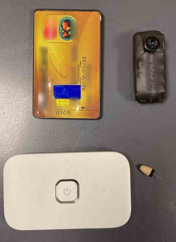 Sınavda şüpheli davranışlarda bulunan Y.Y., Tavşanlı İlçe Emniyet Müdürlüğü Polis Merkezi ekipleri tarafından yakalandı. Yapılan aramada, şahsın üzerinde bulunan kredi kartı şeklinde düzenlenmiş sim kart takılan kart, gömlek düğmesi şekli verilmiş gizli kamera ve şahsın kulağında takılı böcek diye tabir edilen dinleme cihazı ele geçirildi.