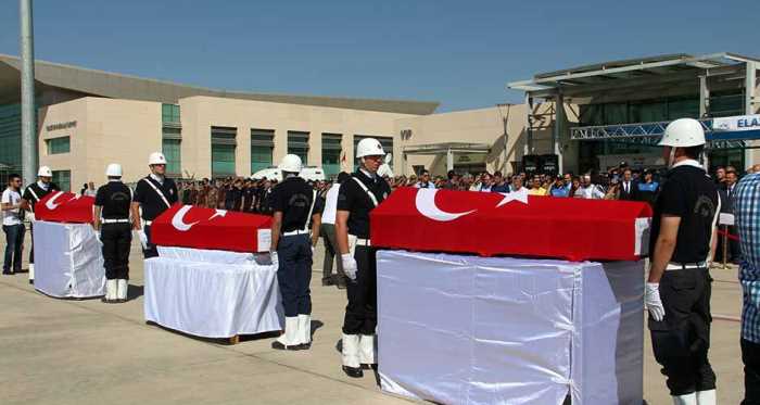 Bir çocuk babası Öztürk (30), iki çocuk babası Özbay (45) ve üç çocuk babası Mutlu'nun (50) Türk bayrağına sarılı naaşları törenin düzenlendiği Elazığ Havalimanı'na getirildi. Şehitlerin naaşları meslektaşlarının omuzlarında katafalka konuldu.
