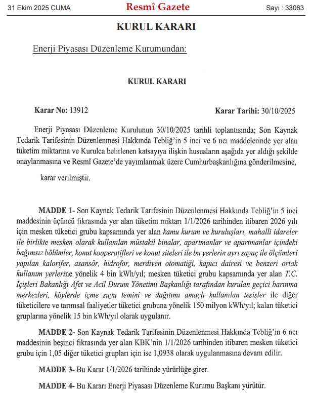 Resmi Gazete’nin bugünkü sayısında yayımlanan karar ile apartmanların ortak kullanım alanlarında tüketilen elektriğe zam geldi. Asansör, hidrofor, otomat ve çevre aydınlatması gibi ortak alanlarda harcanan elektrik faturalarında yıllık limit 4 bin kilovat olarak uygulanacak.