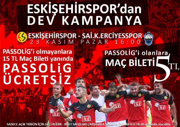 Eskişehirspor’un 23 Kasım Pazar günü oynayacağı Kayseri Erciyesspor maçı için yönetim harekete geçti. Daha önceden Passolig almamış taraftarlar15 TL maç ücreti yanında PASSOLİG ücretsiz olarak verilecek. Ayrıca Passolig almış taraftarlar ise maçı 5 TL’ye izleyebilecek.