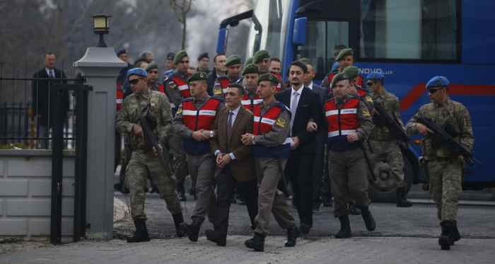 15 Temmuz gecesi Cumhurbaşkanı Erdoğan'a suikast girişiminde bulunan darbeci askerler güvenlik önlemleri altında yargılamanın yapılacağı salona getirildi.