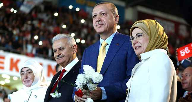 Cumhurbaşkanı Erdoğan, eşi Emine Erdoğan, ile Başbakan Yıldırım ve eşi Semiha Yıldırım birlikte salona girdiler. Platformdan partilileri birlikte selamladılar.
