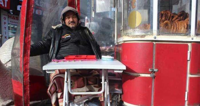 Abdülkadir Erşahinli, "Büyükşehir Belediyesinde simit tezgâhında çalışıyorum. Bu simit tezgahı bizim için sosyal bir proje engelliler için. Başkanımıza teşekkür ediyoruz. Ama daha ayrıntılı bir şekilde mesela ekmek büfesi gibi tezgâhımızı bizlere verirlerse o daha iyi olacak. Şuanda ısınma sorunumuz devam ediyor. Hava şartlarından dolayı yazın ayrı kışın ayrı sıkıntılar çekiyoruz. Biz neticede çalışmak istiyoruz. Engelli olduğumuz için kimseye yük olmadan belediye ye ve devletimize yük olmadan biz çalışmak istiyoruz. Bizde kapalı bir alanda olmalıyız eğer ekmek büfeleri gibi kapalı bir alanda olursak kendi imkânlarımızla da olsa ısınmayı sağlaya biliriz. Buna benzeri bir şey olursa çalışma olarak memnun oluruz. Biz çalışmak istiyoruz neticede, çalışıyoruz da. Biz halkımızla her zaman için iç içeyiz. Biz ısınmayı sağlayamıyoruz. Mesela ben şuan ayaklarımı hissetmiyorum. Ama ben çalışmak zorundayım. Çalışmazsam, emekli veya sosyal yardımlarıyla bir ailenin geçinmesi mümkün değil. Bundan dolayı biz bu tezgâhlarda çalışmak zorundayız. Bu tezgâhları verdikleri içinde teşekkür ediyoruz. Bu tezgâhlar olmazsa biz geçimimizi sağlayamayız. Biz engelliler olarak mesela şuan da yüzde 80, yüzde 90 engelli kardeşlerimizde var. Yani ısınma sorunu başlı başlıca bir sorun bizim için. Korla ısınmaya çalışıyoruz. Kor her zaman gelmiyor. Ancak yine de fırınlarımıza teşekkür ediyorum. Bizi düşünüp yolladıkları için. Bizler engelli olduğumuz için her şeye muhtaç olduğumuz için kendi işimizi kendimiz hallediyoruz. Mesela ailemizin desteği olmadan biz bir şey yapamıyoruz. Sosyal faaliyetlerde yararlanamıyoruz. Bizim için ısınma sorunu büyük bir problem" dedi.