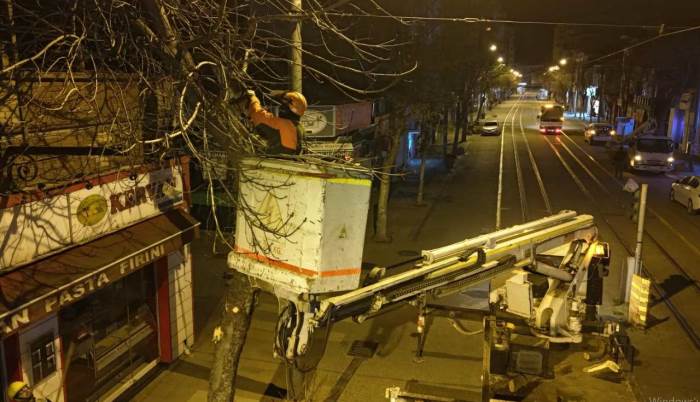 Tramvay hatları güzergâhı boyunca belirli bölgelerde bulunan ağaçların dalları risk oluşturunca, Eskişehir Büyükşehir Belediyesi ekipleri tarafından budandı.