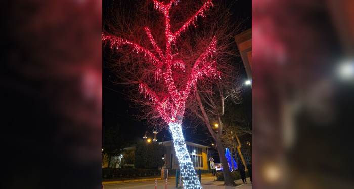 Eskişehir Büyükşehir Belediyesi binası önündeki ağaç, akşam saatlerinde kırmızı ve beyaz LED ışıklarla donatılarak görsel bir şölen sunuyor. Vatandaşlar ışıklandırmayı hayranlıkla izliyor.