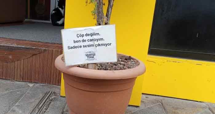 Eskişehir'de dibine çöp atılan saksının toprağına konulan 'Çöp değilim, ben de canlıyım. Sadece sesim çıkmıyor' yazılı mesaj görenlerin dikkatini çekti.