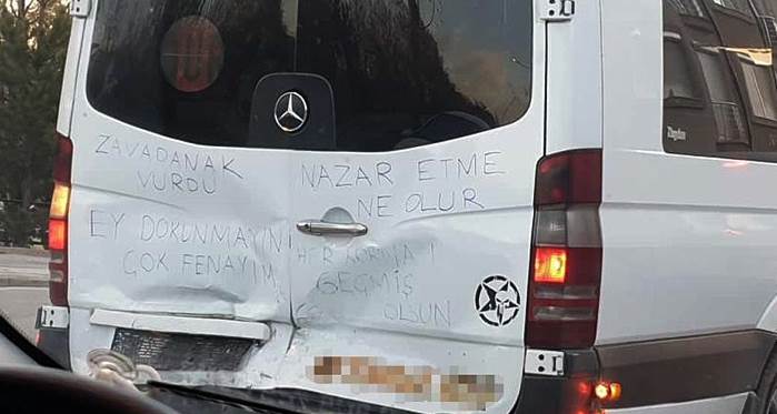 Eskişehir’de bagaj kısmına aldığı darbe sonucu hasar gören minibüsün arkasına sürücüsü tarafından yazılan “Ey dokunmayın çok fenayım” ve “Her korna bir geçmiş olsun” yazıları trafiktekilerin dikkatini çekti.