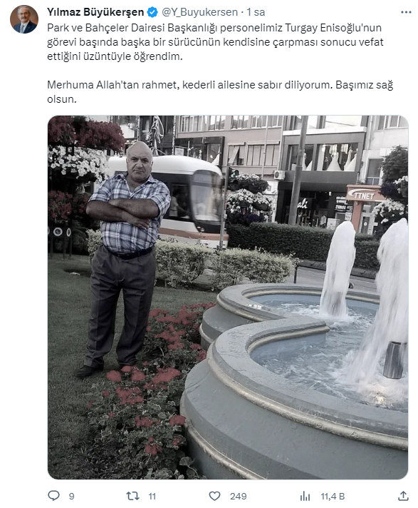 "Büyükşehir Belediyesi Park ve Bahçeler Dairesi Başkanlığı personeli Turgay Enisoğlu'na Allah’tan rahmet, ailesine, sevenlerine ve çalışma arkadaşlarına başsağlığı diliyorum."