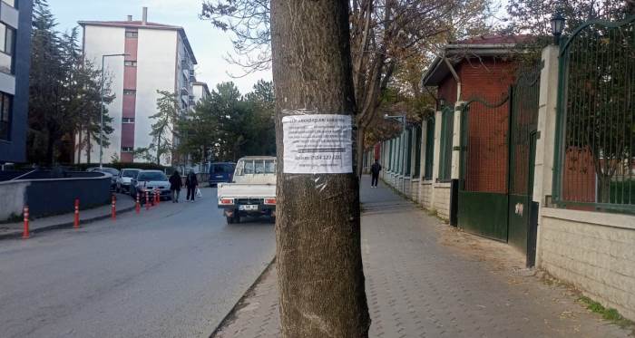 Eskişehir’in Şirintepe Mahallesi Yetişenler Sokak’ta bir ağaca asılan ilan, dikkat çekti. Kaldırım kenarındaki ağaca şeffaf poşet içinde yerleştirilen ilan, çevrede yürüyen vatandaşların ilgisini topladı.