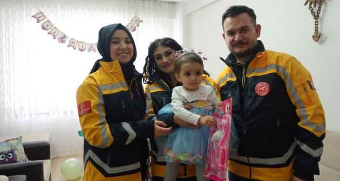 Eskişehir’de göbek bağı iki kez boynuna dolanan ve acil olarak ambulansta doğan Almira bebek, 2’nci yaşını doğumunu yaptıran sağlık ekibiyle kutladı.