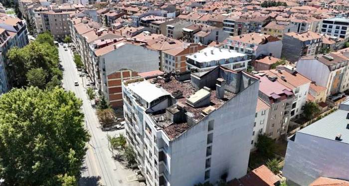 Eskişehir'de dün akşam saatlerinde çıkan yangında çatısı adeta kül olan 3 bloklu apartmanda meydana gelen hasar, gün aydınlanınca dron ile havadan görüntülendi.