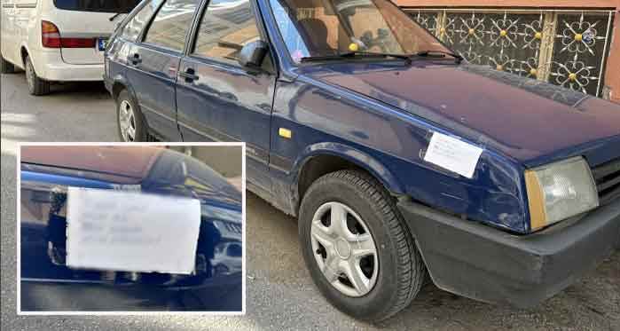 Yazıda, “Buraya vurup kaçan kişi sana hakkımı helal etmiyorum “ sözleriyle otomobiline çarpıp kaçan kişiye tepki veren dile vatandaş, mağduriyetini böyle gösterdi.