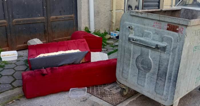 Yeşiltepe Mahallesi’nde bir çöp konteynerinin yanına bırakılan eski ev eşyaları ve koltuk parçaları çevrede görüntü kirliliğine neden oldu. Düzensiz atık bırakılması tepki topladı.