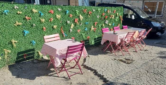 Eskişehir'de bir kafe, kaldırıma yerleştirdiği pembe masa ve sandalyelerle adeta yaya yolunu işgal etti.