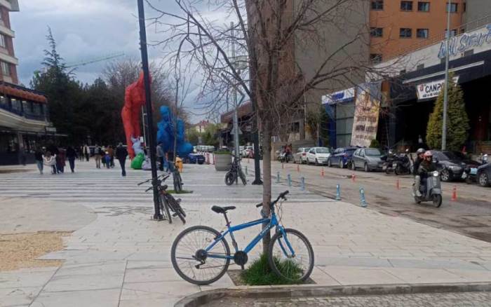 Bulvar üzerindeki bir AVM önünde, bisikletlerin kaldırım kenarındaki ağaçlara kilitlendiği görüldü. Yoğun yaya trafiğinin bulunduğu bölgede bu durum, alışılmadık bir görüntü oluşturdu.