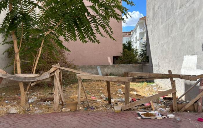 Eskişehir Eskibağlar Mahallesi'nde iki bina arasında yer alan boş arazi, atıl durumda ve çöplerle kaplı.