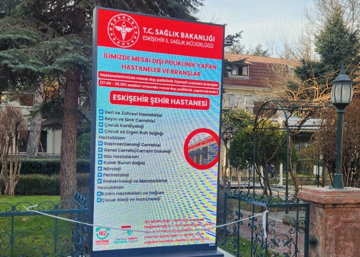 Eskişehir İl Sağlık Müdürlüğü binası önünde bulunan dijital panoda, mesai saatleri dışında poliklinik hizmeti veren hastaneler ve ilgili branşlara yönelik bilgilendirmeler paylaşılıyor. Uygulamayla vatandaşların sağlık hizmetlerine erişiminin kolaylaştırılması hedefleniyor.