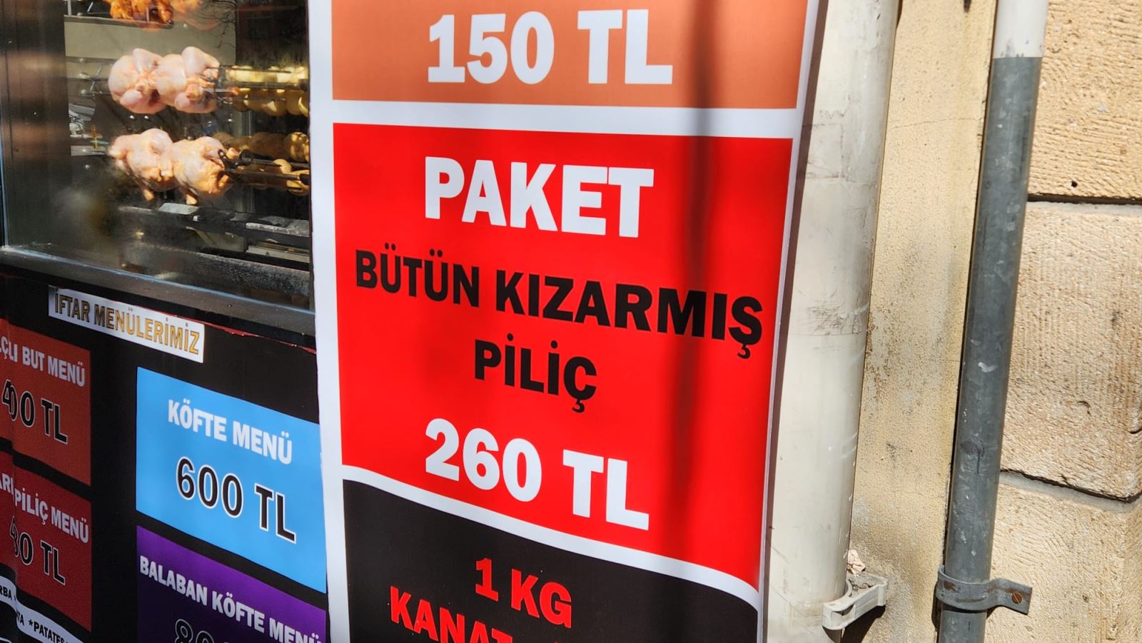 Kentteki bazı işletmelerde bütün kızarmış piliç 260 TL’den satışa sunuluyor. Artan maliyetlere rağmen ürünün pratik olması, talebin sürmesini sağlıyor.