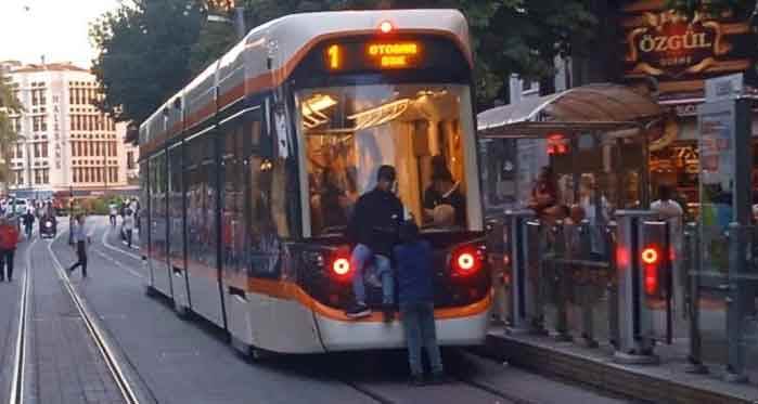 Eskişehir’de bir tramvayın uç kısmına tutunarak seyahat yapan iki küçük çocuk görenleri ‘bu kadar da olmaz’ dedirtti