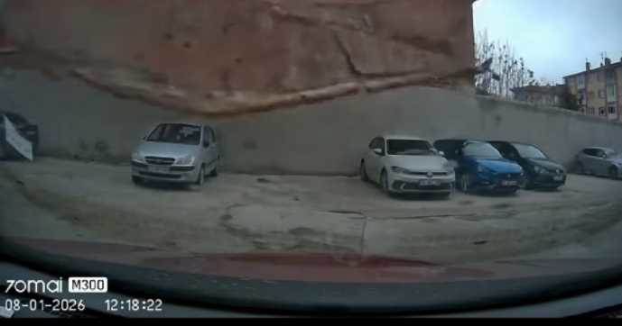 Edinilen bilgilere göre, Hacı Hüsnü Sokak’ta bulunan boş binanın çatı duvarı, şiddetli rüzgârın etkisiyle yanındaki otoparkın içine devrildi. Olay anı çevredeki vatandaşlar tarafından görüntülendi ve büyük bir şaşkınlık yaşandı.
