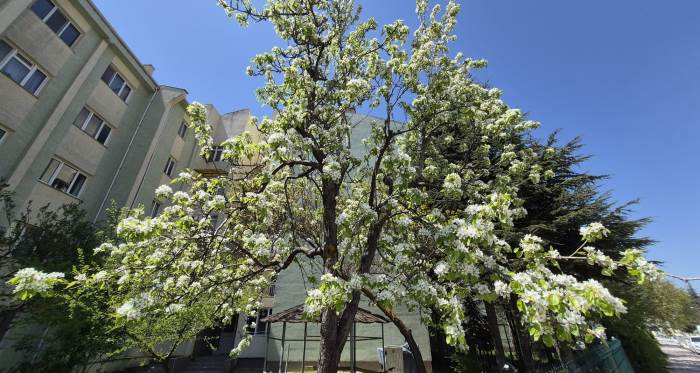 Eskişehir’in Çankaya Mahallesi’nde baharın gelişiyle çiçek açan armut ağacı, oluşturduğu beyaz görüntüyle vatandaşların ilgisini çekti.